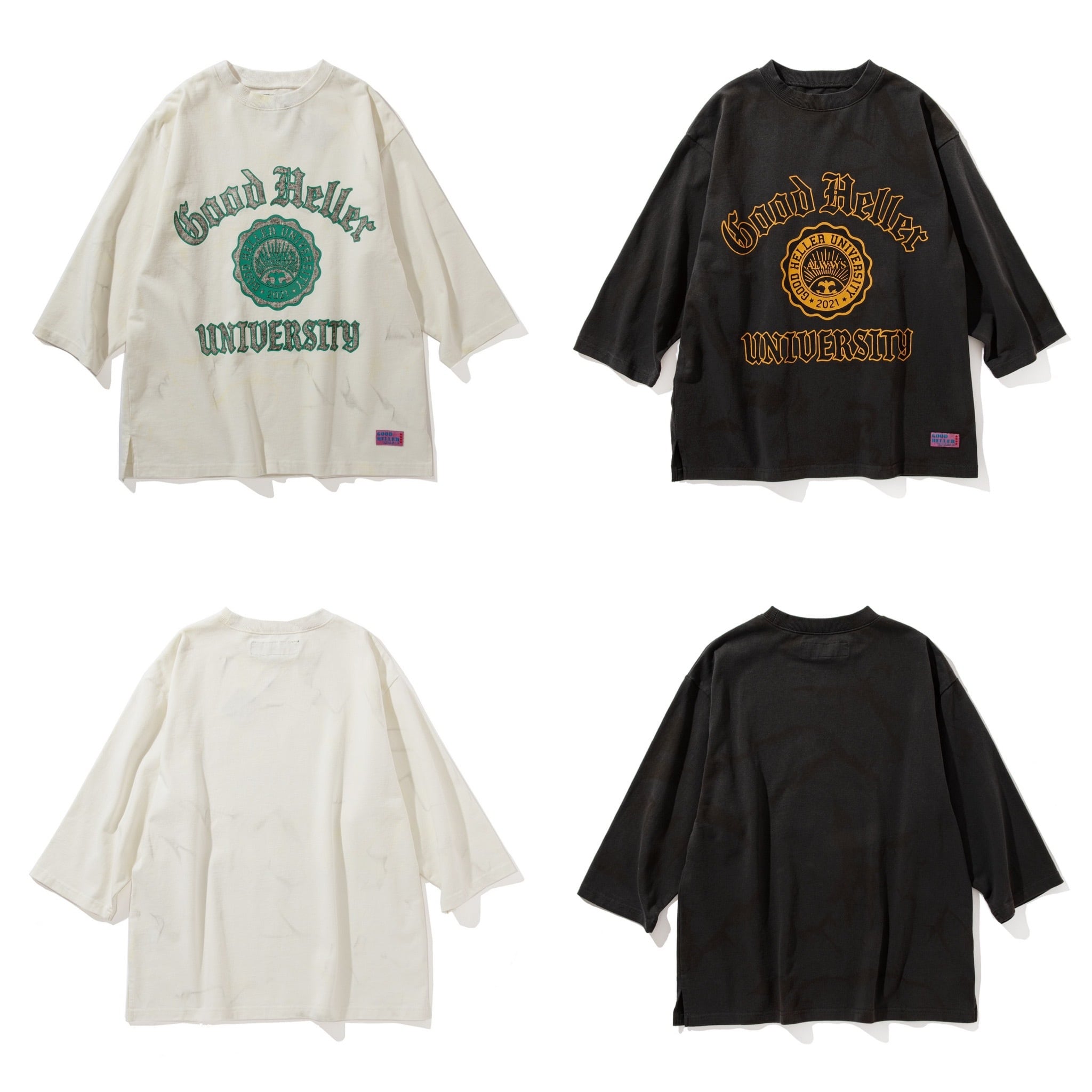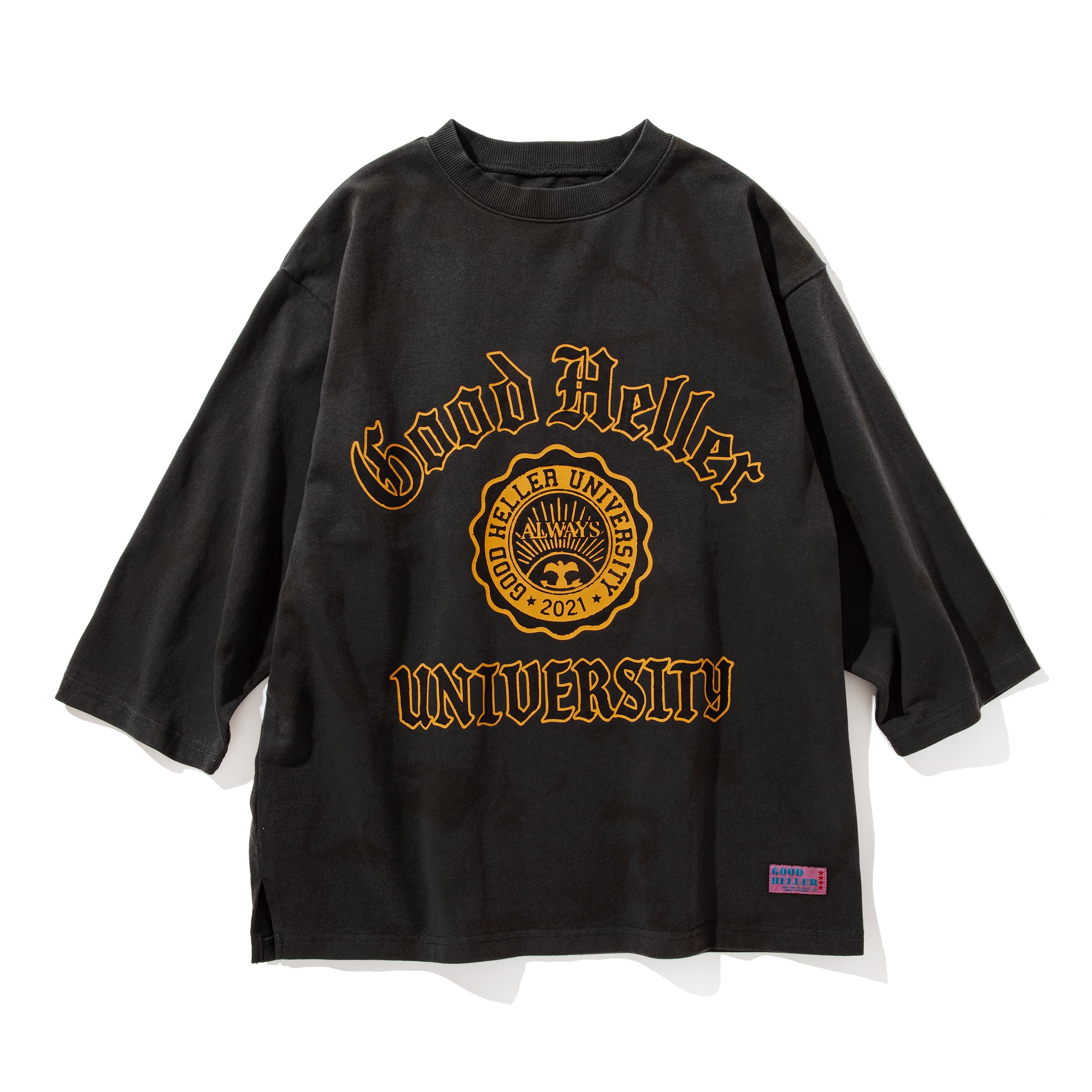 フロントにはGOOD HELLER UNIVERSITYと架空の大学名をフロッキーとシルクスクリーンにてカレッジロゴをプリントしております。