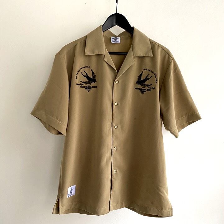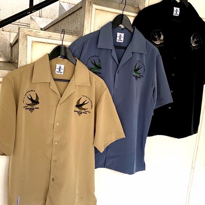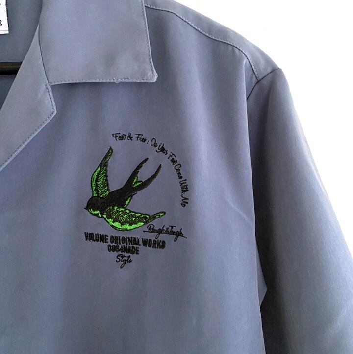 スワロータトゥーのイラストを刺繍で両胸に施したオープンカラーワークシャツです。