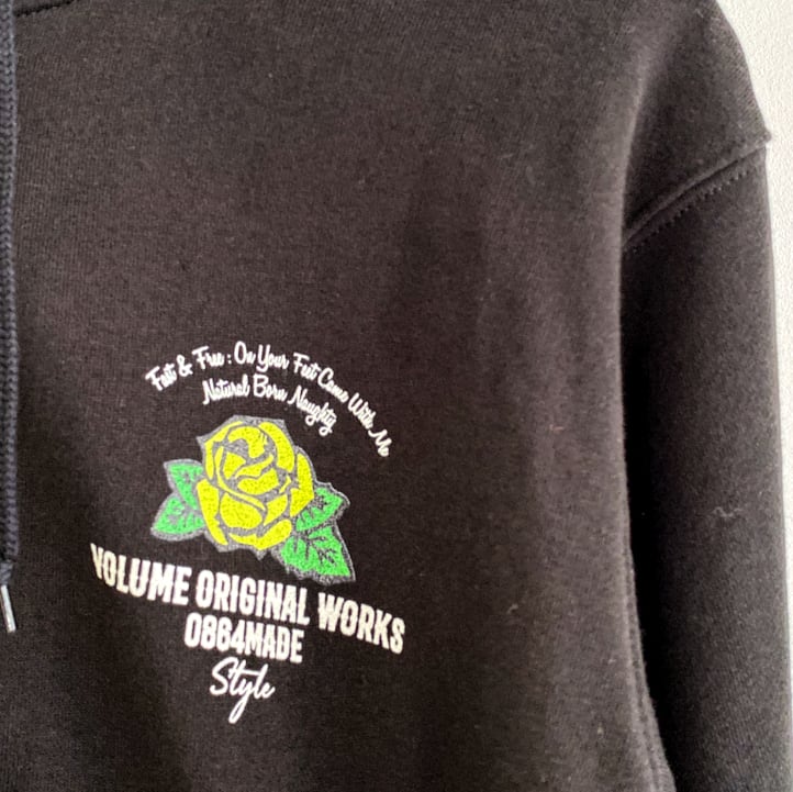 グアダルーペを背中に、バラのイラストを左胸にインクジェットプリントで施したジップパーカー。
