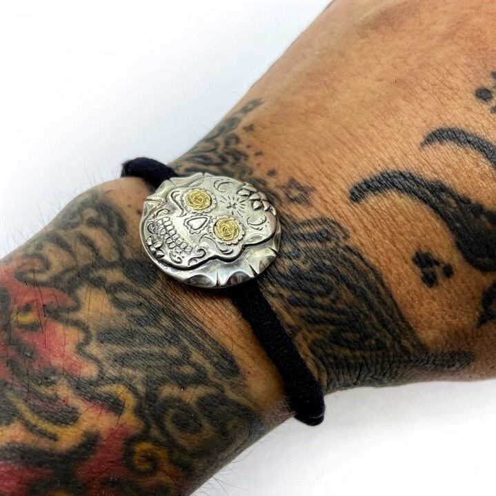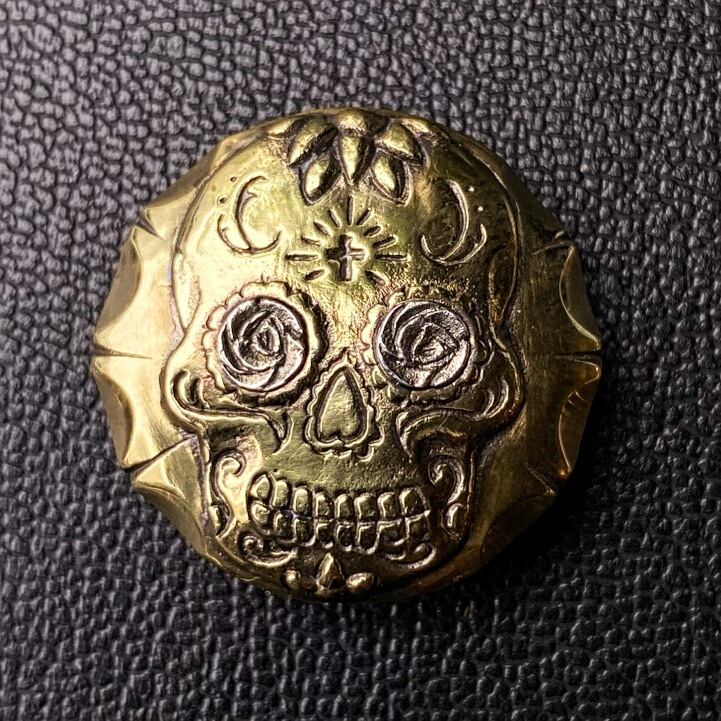 細部まで彫り込まれたカラベラ(メキシカンスカル)が目を引くコンチョ。